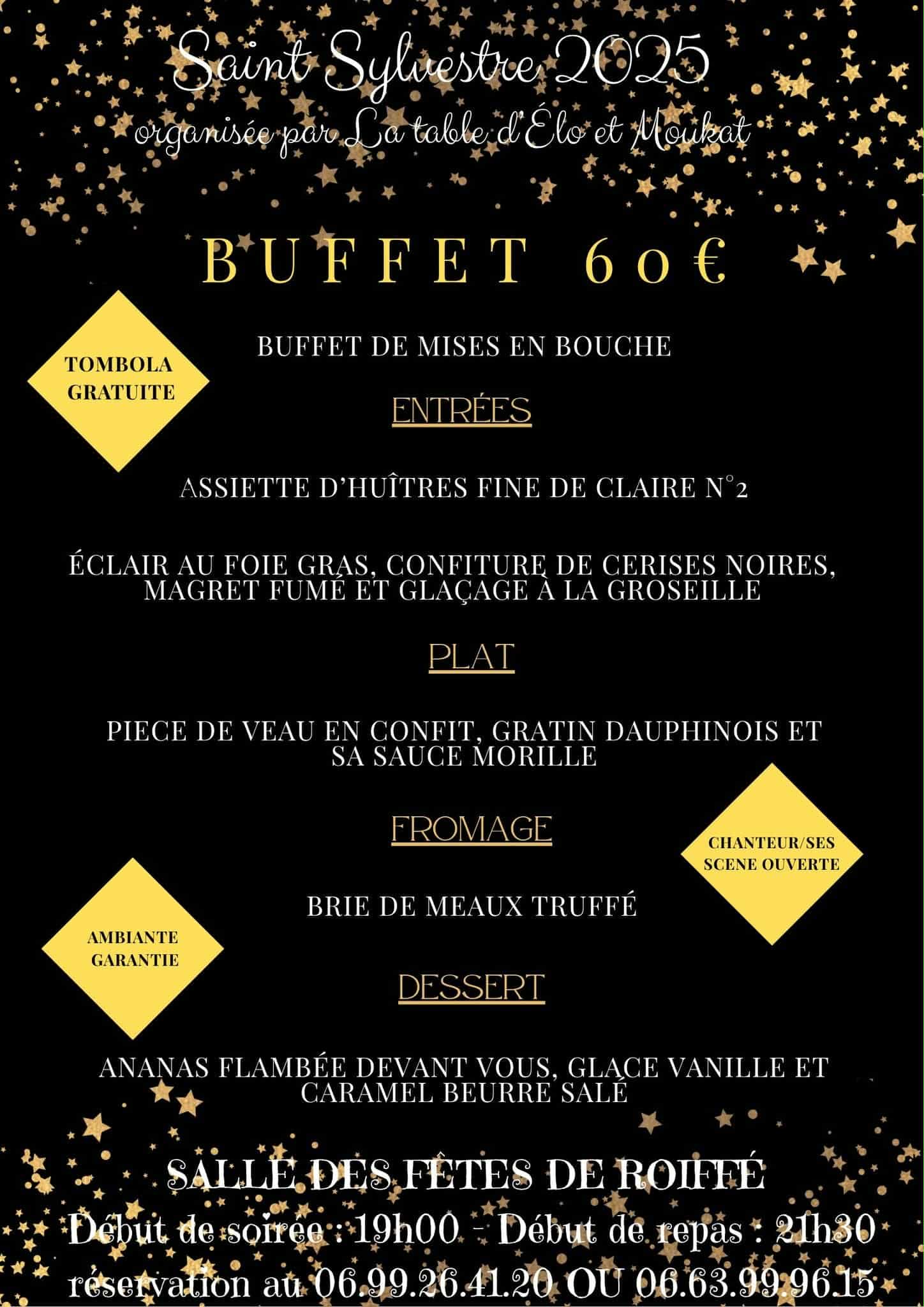 Buffet de mises en bouche, Assiette d’huîtres, Éclair au foie gras, confiture de cerises noires, magret fumé et glaçage à la groseille, Pièce de veau en confit, gratin dauphinoi et sa sauce morille, Fromage – Brie de meaux truffé, Ananas flambé devant vous, glace vanille et caramel beurre salé